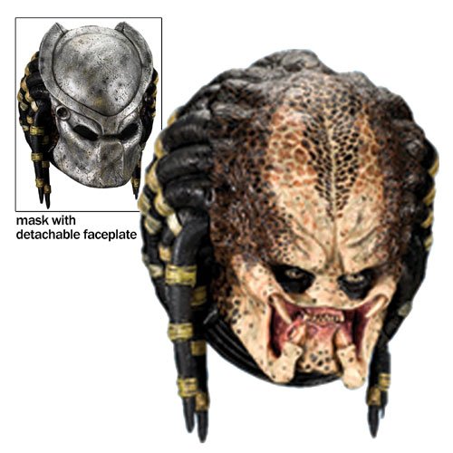 This unique latex mask offers some separate dreadlocks, deluxe paint job and closed mouth mandible so the Predator Helmet can fit into place. Removable plastic faceplate also included, covers face of mask only, and is held in place by elastic bands. One size fits most adults. This is an officially licensed Alien vs. Predator?รครณ product. Remember the hands to complete the look!Dimensions (LxWxH):13 x 7 x 1
