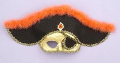 - Gold face pirate molded plastic mask has elastic band which goes around head to hold mask on, "hat" is black with orange feathers on top, - accented with large red jewel, gold braiding around edges of face mask portion, mask fits over eyes and top part of face, attached eye patch on one eye which lifts up to uncover eye hole