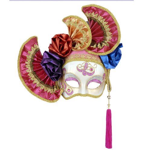Make a head-turning entrance with our Pink Fanning Headdress Venetian Mask. This extravagant Venetian mask features a beautiful fanning headdress consisting of 3 fans and 3 rosette flowers. The fans are in metallic pink and pastel orange colors with gold trim. The fabric flowers are in a metallic purple, burnt red and blue. The Venetian mask has gorgeous glitter designs and gems. A gold braided rope casually dangles off the side of the mask with beads and a pink tassel. The Mardi Gras mask is attached to a headband that allows it to be flipped up and down for convenient wear. Our Pink Fanning Headdress Venetian Mask is an excellent costume accessory to wear to a Mardi Gras event, Masquerade ball, with a Halloween costume or even to hang on the wall as decor. One size fits most adults.