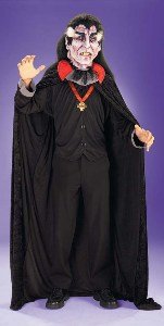 Two sided latex mask with vampire man face as the front and vampire lady face on the back with attached faux hair. Front of mask is a polyester vampire shirt with attached jabot style collar, button accents, and attached medallion in the front. Separate cape is long Black velvet with a red collar accent and front tie to accent the Vampire front. There is padding in the back to help with the illusion of of the backside being the lady vampire. Back of cape has attached arms and helps to complete the vampire lady side the costume. One size fits most. Pants not included.